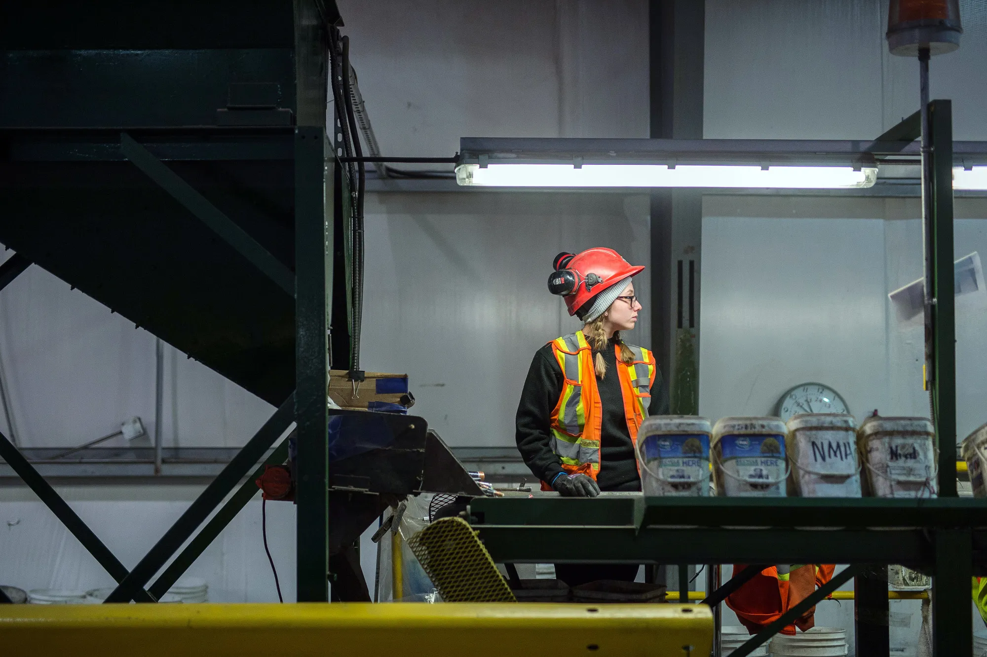 一名员工在安大略省波特科尔本的回收设施中在传送带上分类电池。