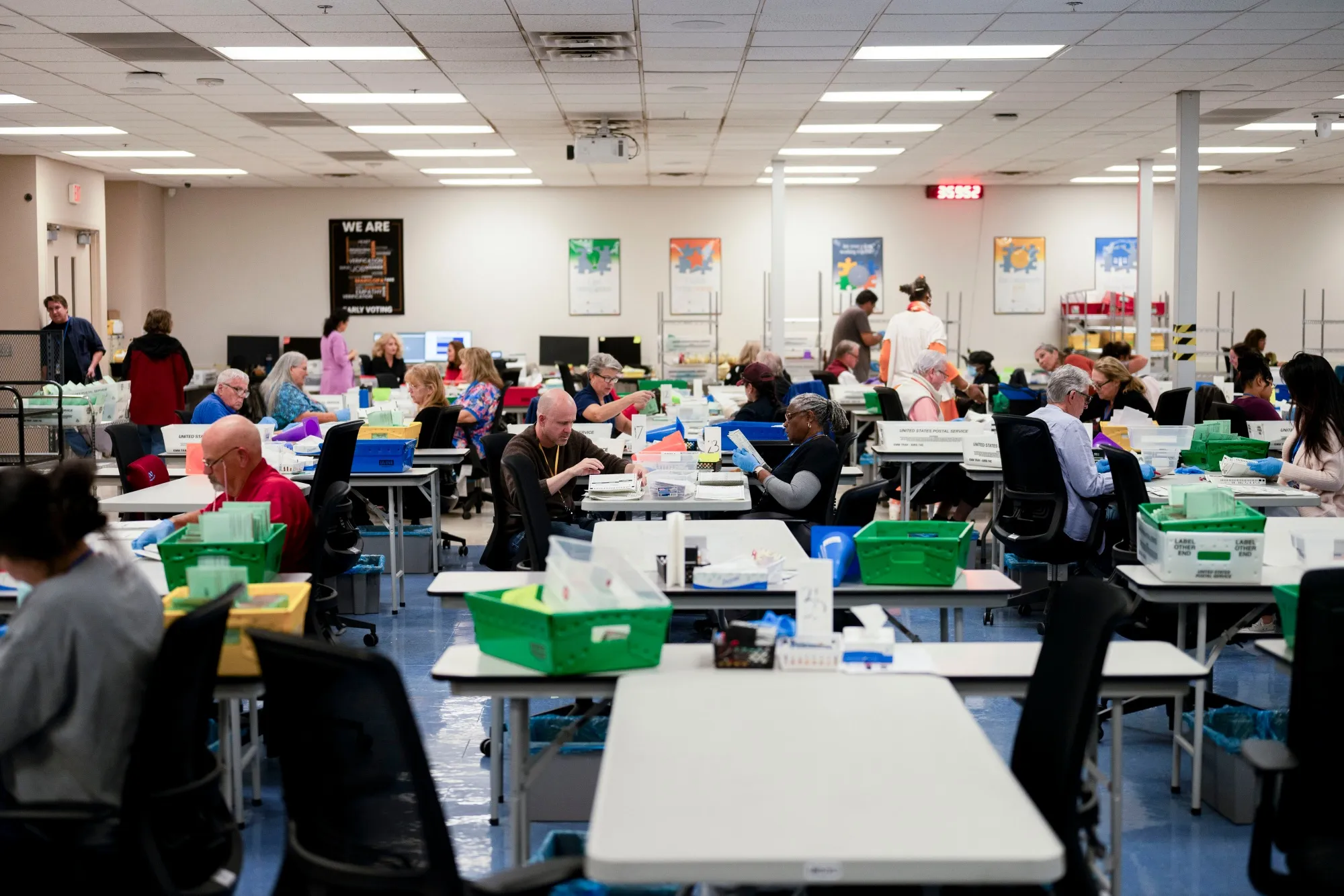 选举官员在凤凰城的马里科帕县计票和选举中心(MCTEC)整理准备计票的选票。摄影师:多米尼克·瓦伦特/彭博社 截至周五凌晨12:00,美国超过98%预计投票已计入的县中,特朗普在其中2380个县的投票份额有所提升。哈里斯在其中仅有231个县超过了拜登2020年的得票率。许多县是受到九月份飓风海伦影响最严重的乔治亚州和北卡罗来纳州,抑制了投票率。