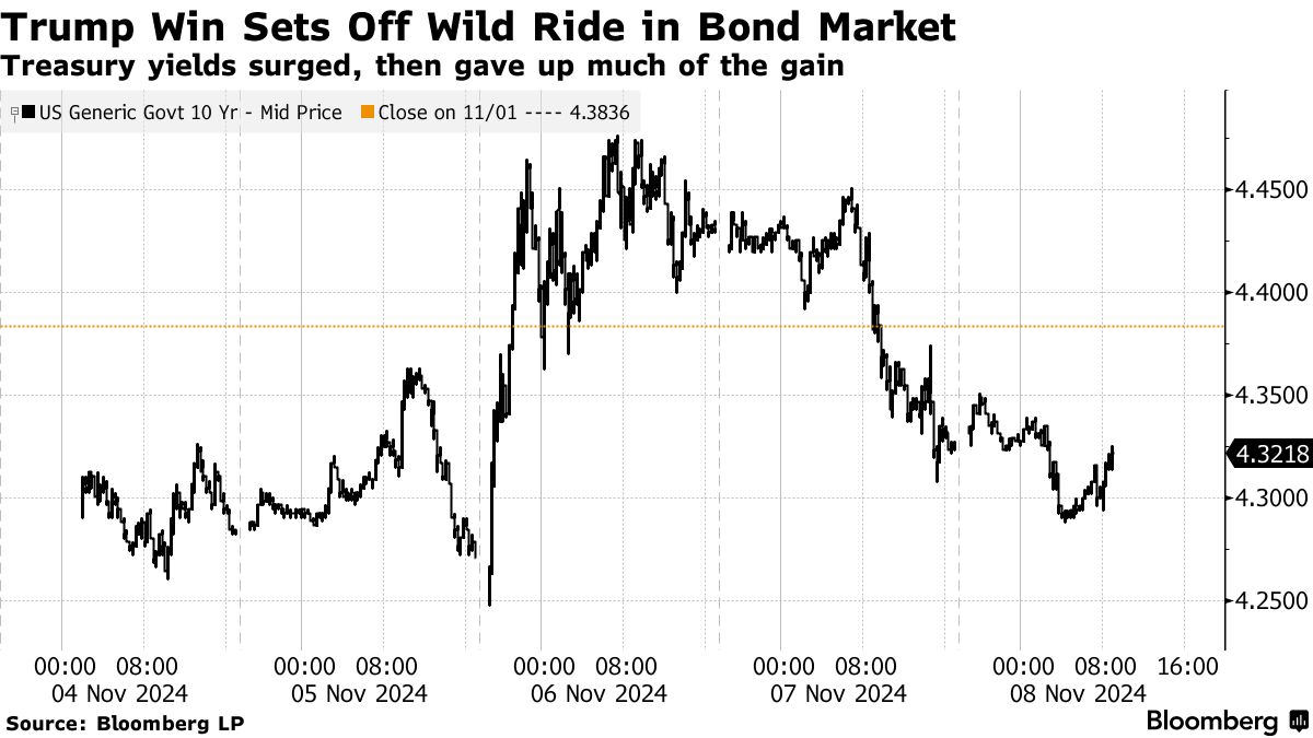 在特朗普本周获胜后,债券价格急剧下跌,因市场猜测这位共和党人将通过减税和对进口征收关税来重新点燃通货膨胀。
