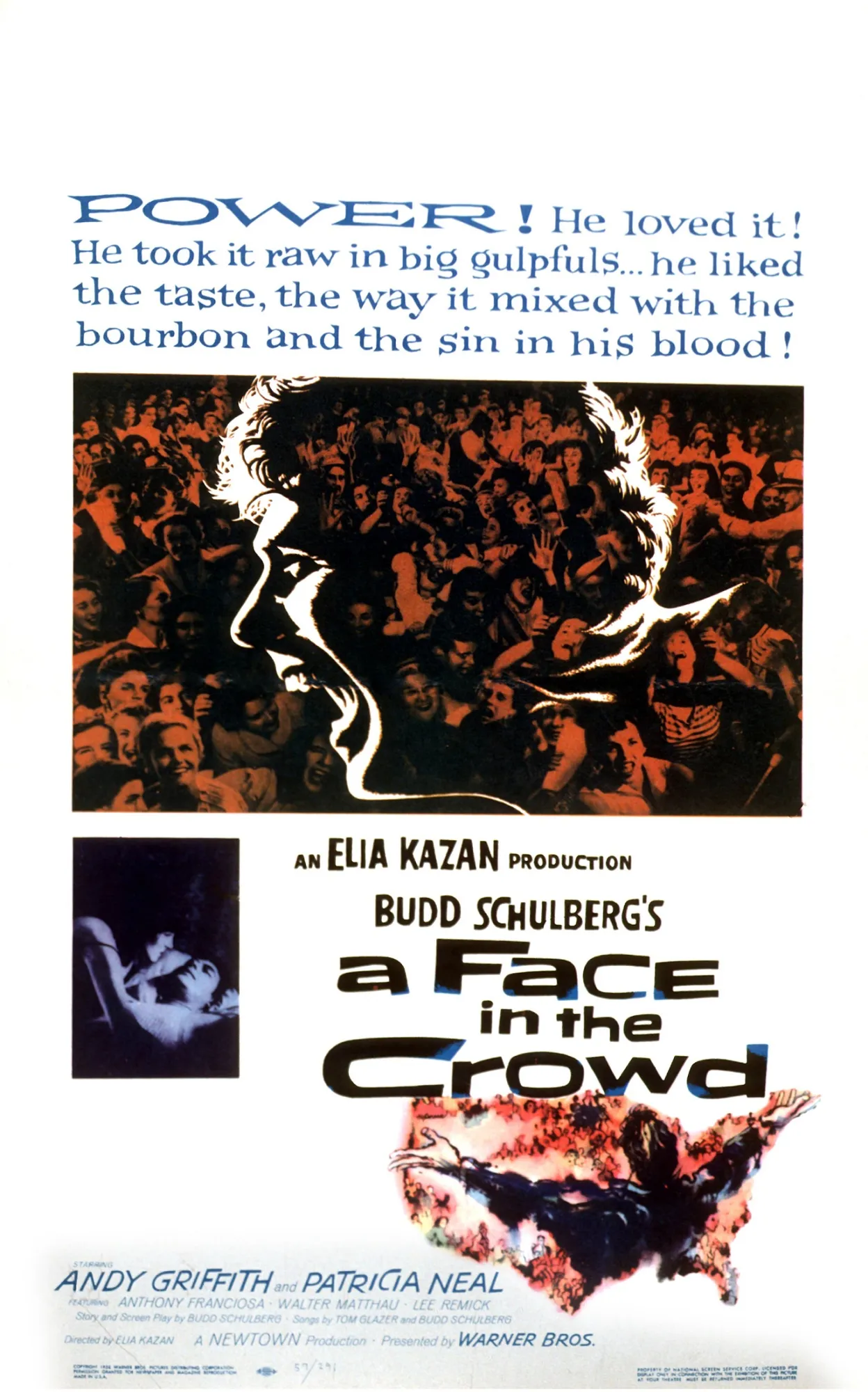电影的海报*《人群中的面孔》*(1957)来源:Photofest当罗德斯的观众听到他在热麦克风下辱骂他们是白痴时,他的受欢迎程度骤降,成为一个破碎的人。在最后一幕中,一个角色评论说罗德斯可能曾经愚弄过人们,但“我们会看透他——这就是我们的力量。”
