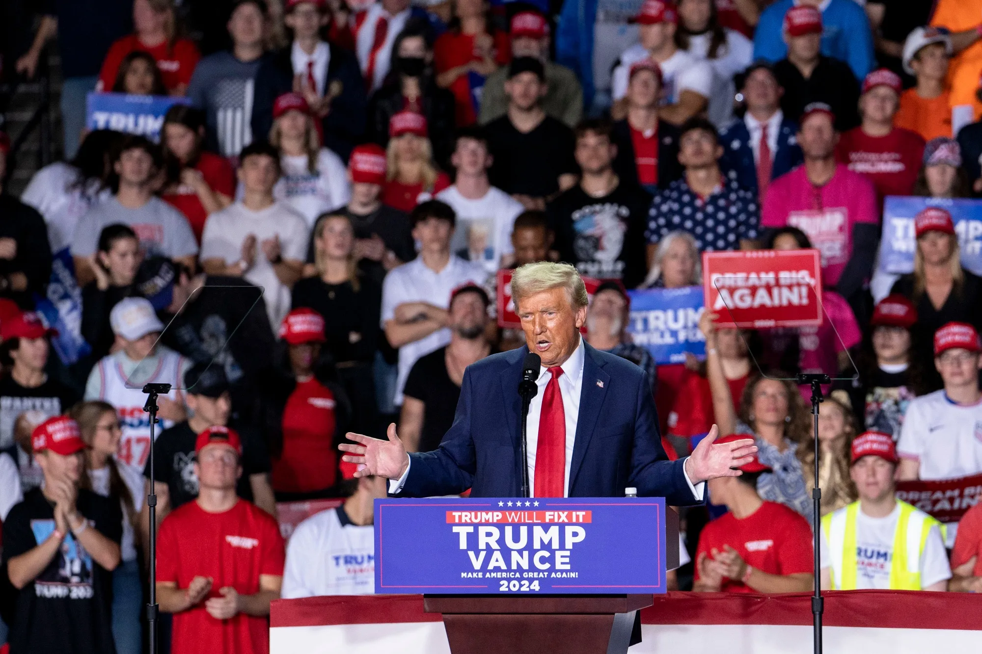 美国前总统唐纳德·特朗普在密歇根州大急流城的范安德尔竞技场举行的竞选闭幕活动上。