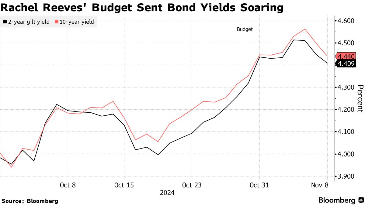 市场对上周预算的反应突显了财政大臣所承受的风险。投资者重新调整他们的投资组合,以反映1420亿英镑的额外借贷,导致政府债券收益率飙升,抹去了里夫斯在其稳定规则下的余地。