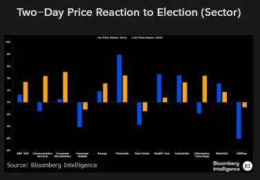 在股市中,2016年和2024年之间的差异在选举之前已经显而易见。根据彭博情报首席股票策略师吉娜·马丁·亚当斯的说法,美国股票在10月份的表现优于国际同行,这在选举年是罕见的。