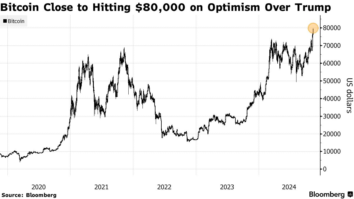 比特币首次逼近80,000美元,受到当选总统唐纳德·特朗普对数字资产的支持以及国会中亲加密货币立法者的前景的推动。