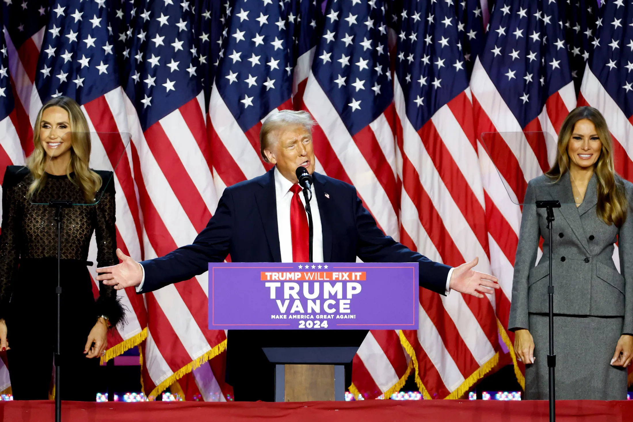 唐纳德·特朗普,中央,在佛罗里达州西棕榈滩的选举之夜活动中对支持者讲话,时间是11月6日。摄影师:埃娃·玛丽·乌斯卡特吉/彭博社 欢迎来到《预测》的第一期,这是来自彭博社周末版的新周日通讯。我们在这里帮助您思考未来——从下周到下个十年——提供来自世界各地的预测和分析。本周我们将关注美国选举的反应、COP29的启动、温迪的人工智能等。