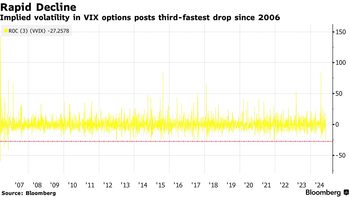 所谓的波动性波动(VVIX)——当对VIX期权的对冲需求减少时会下降——在周二到周四之间暴跌,数据显示,这是自金融危机以来第三快的下降速度。