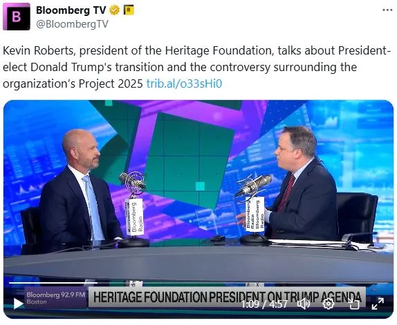 今天在彭博电视台的 权力的平衡 上午版中,主持人乔·马修采访了遗产基金会主席凯文·罗伯茨,讨论特朗普过渡以及围绕该组织2025项目的争议。