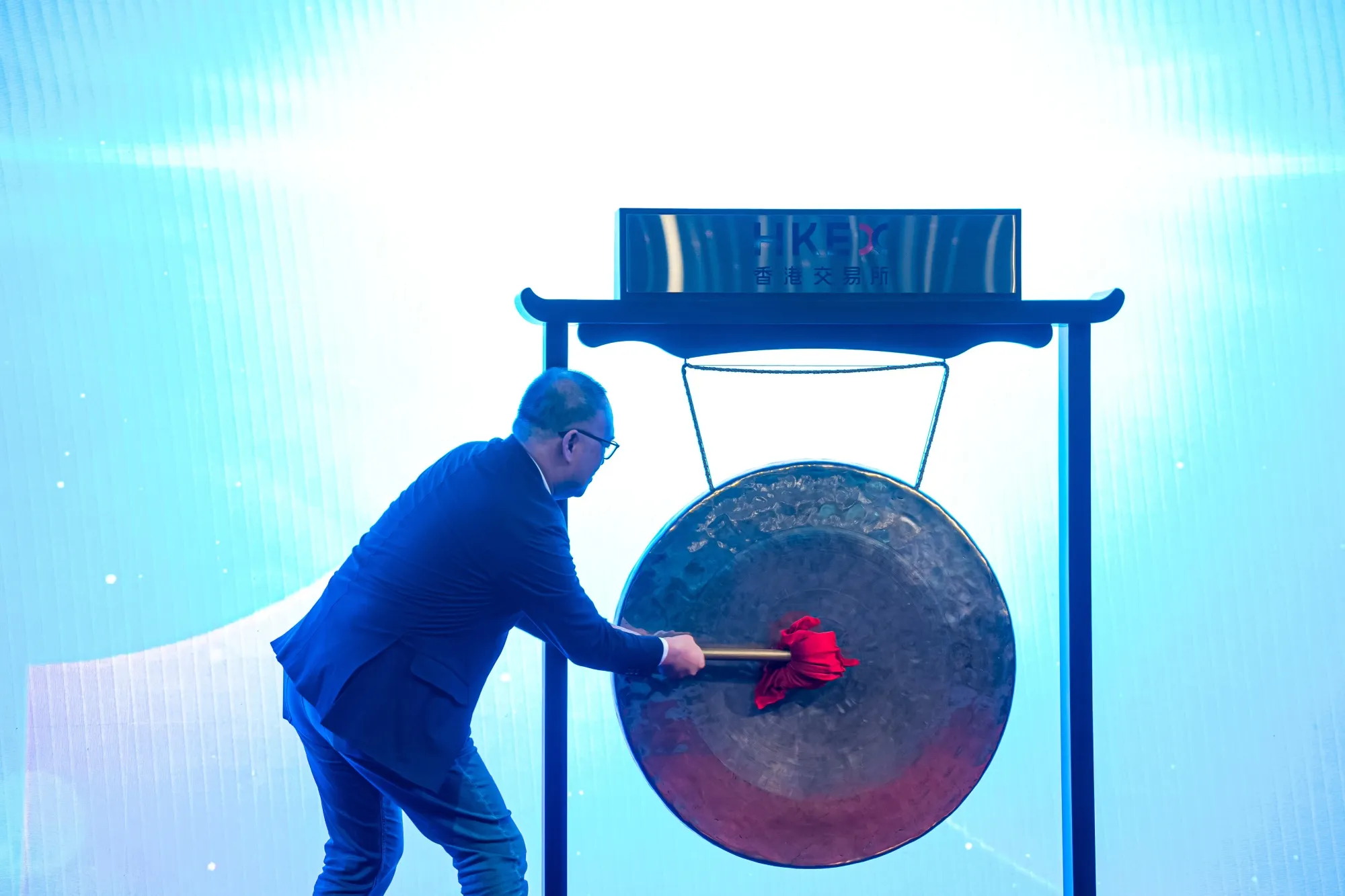 凯·余,地平线机器人公司的首席执行官和创始人,在10月24日香港证券交易所的上市仪式上敲响了锣。