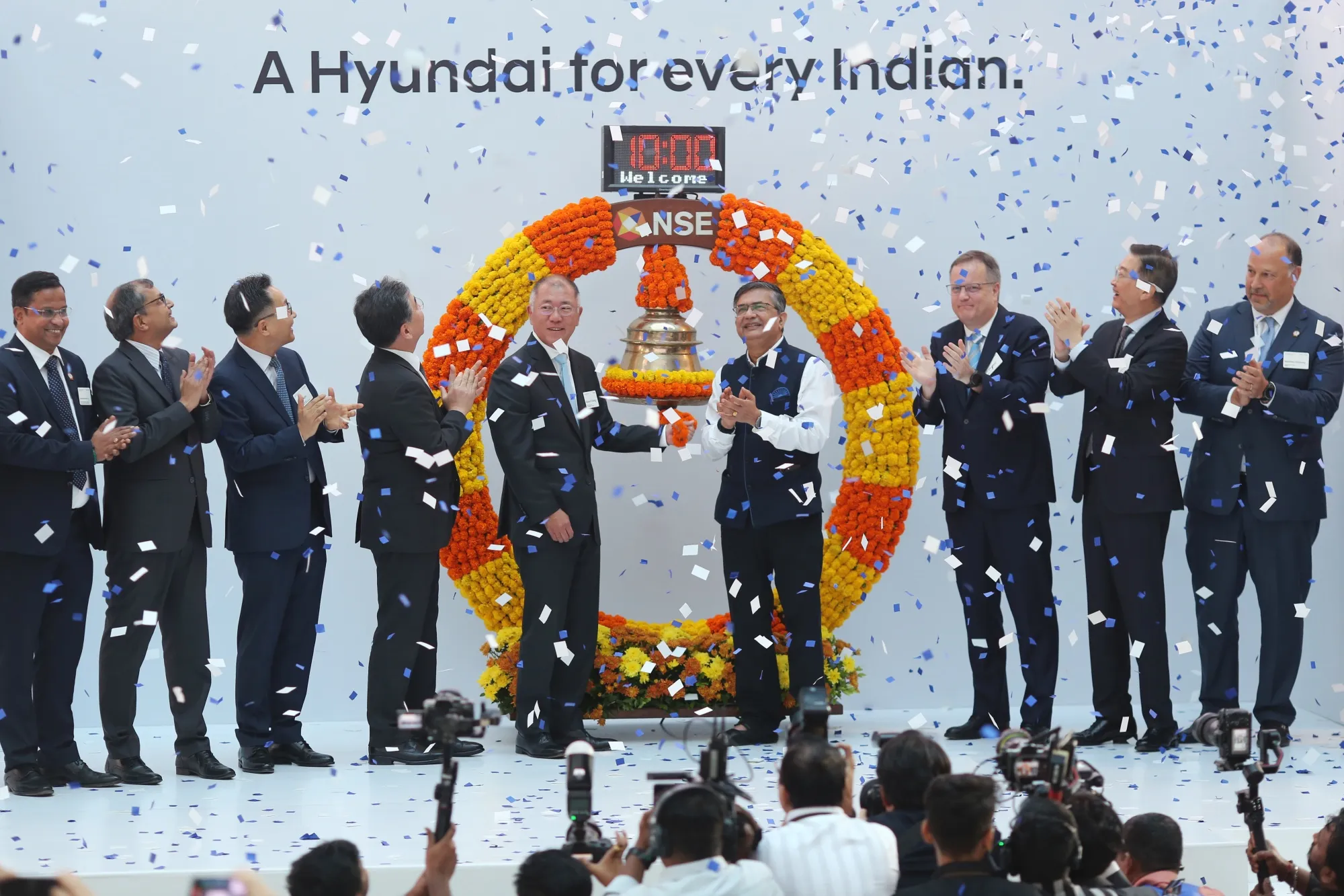 在孟买国家证券交易所(NSE)举行的现代汽车印度有限公司上市仪式上,五彩纸屑纷纷落下,时间是10月22日。摄影师:Dhiraj Singh/Bloomberg其他在列的公司包括食品配送公司Swiggy Ltd.、HDB金融服务有限公司和Carraro SpA的印度分公司。