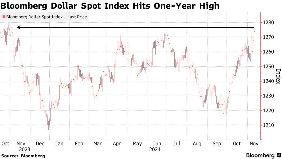 美国选举结果引发了一系列旨在从美元走强中获利的交易,因为特朗普计划减税和提高关税预计将刺激通货膨胀。由于共和党被看好将在众议院获胜,该党看起来将在明年控制立法和行政两个政府部门——这一结果将使特朗普更容易实施他的竞选政策。