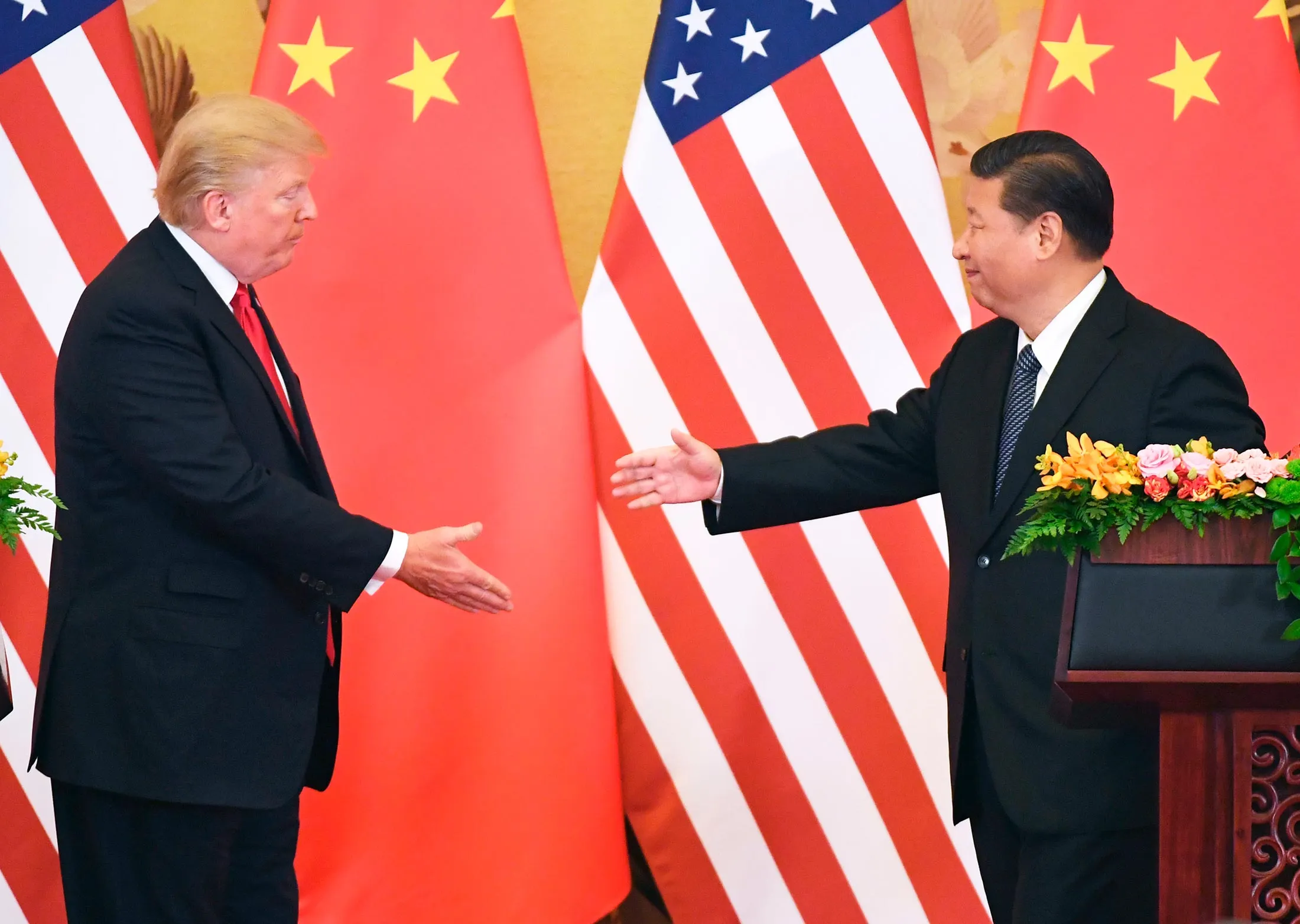 美国总统唐纳德·特朗普与他的中国同行习近平在2017年北京的联合新闻发布会上。