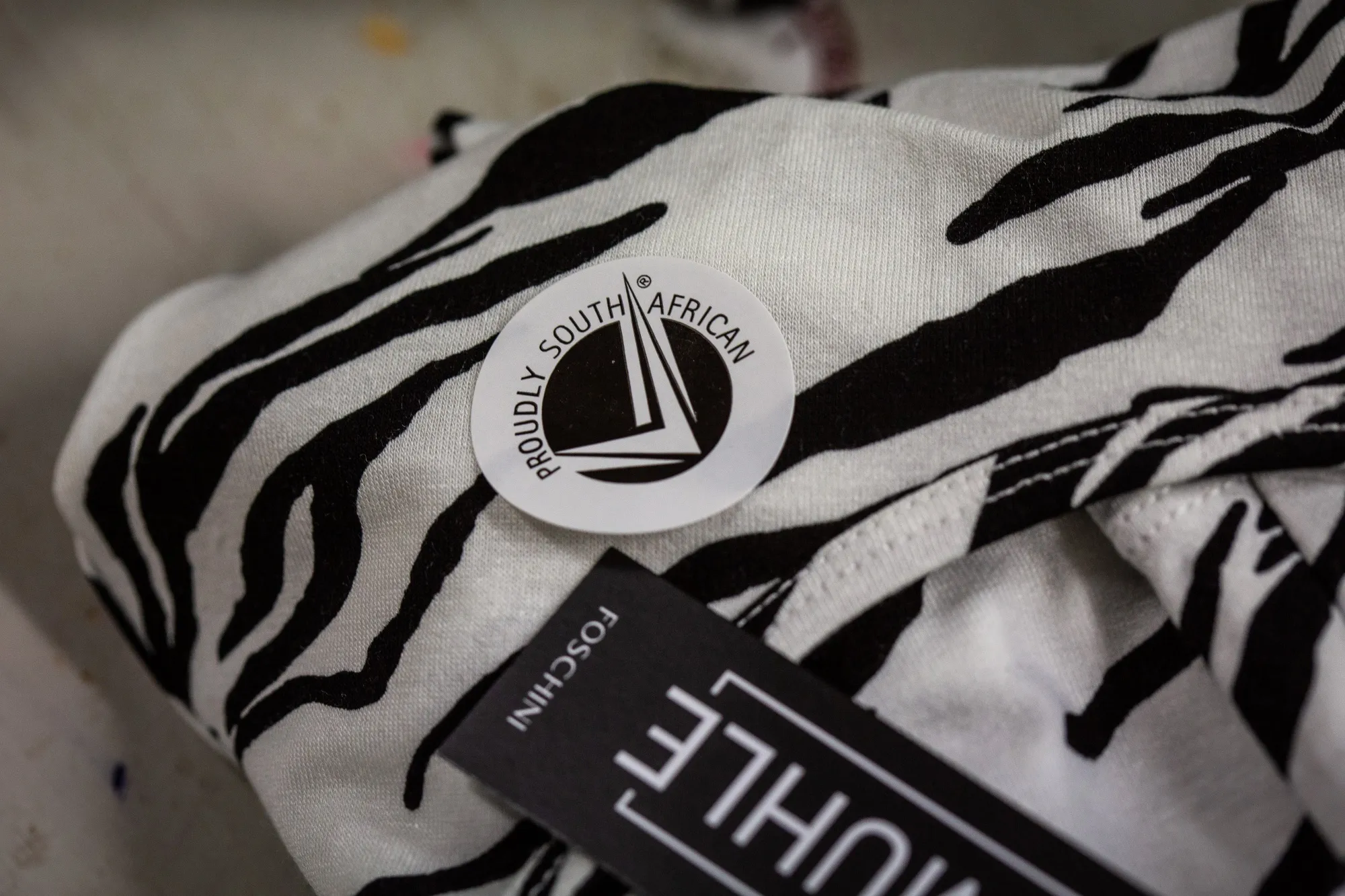 一张在开普敦由福斯奇尼集团有限公司运营的纺织厂的女士衬衫上的贴纸。