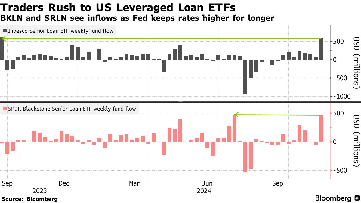 Invesco高级贷款ETF(代码BKLN)——追踪浮动利率债务的最大基金——在过去一周获得了5.76亿美元的资金。这是其一年多以来最大的周收入。与此同时,SPDR黑石高级贷款ETF(SRLN)则结束了连续两周的资金流出,获得了4.64亿美元的资金。它上一次看到如此大规模的资金流入是在四个月前。