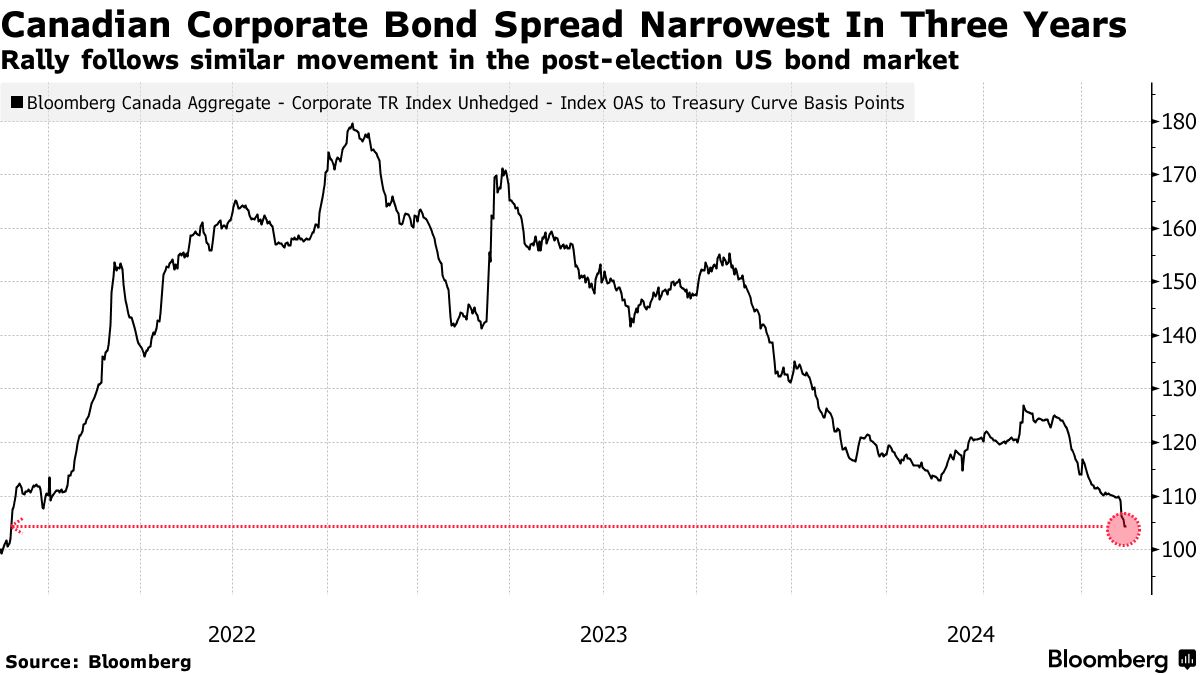 潜在的销售可能发生在加拿大企业债券利差自2021年底以来与政府债券基准相比处于最窄水平的时候,利差接近1.05个百分点,依据彭博社的指数。这一反弹与特朗普当选后美国的类似涨幅相呼应,许多人认为这将导致企业减税和放松监管。