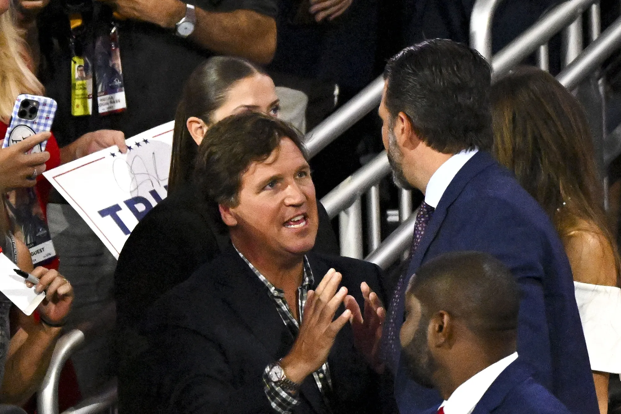 卡尔森(左)和唐纳德·特朗普 Jr. 在共和党全国大会上。摄影师:帕特里克·T·法伦/法新社卡尔森现在在X上进行网络广播,他对填补国家安全职位有一些其他想法。他 采访了埃尔布里奇·科尔比,一位前副助理国防部长,并表示:“他可能在新政府中发挥重要作用。”