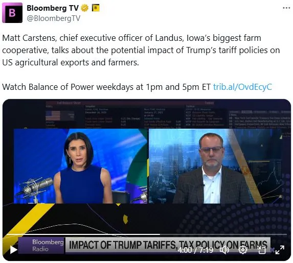 今天在彭博电视台的 权力平衡 早间版中,主持人乔·马修和凯莉·莱因兹采访了马特·卡斯滕斯,爱荷华州最大的农场合作社Landus的首席执行官,讨论特朗普政策对美国农业出口的潜在影响。