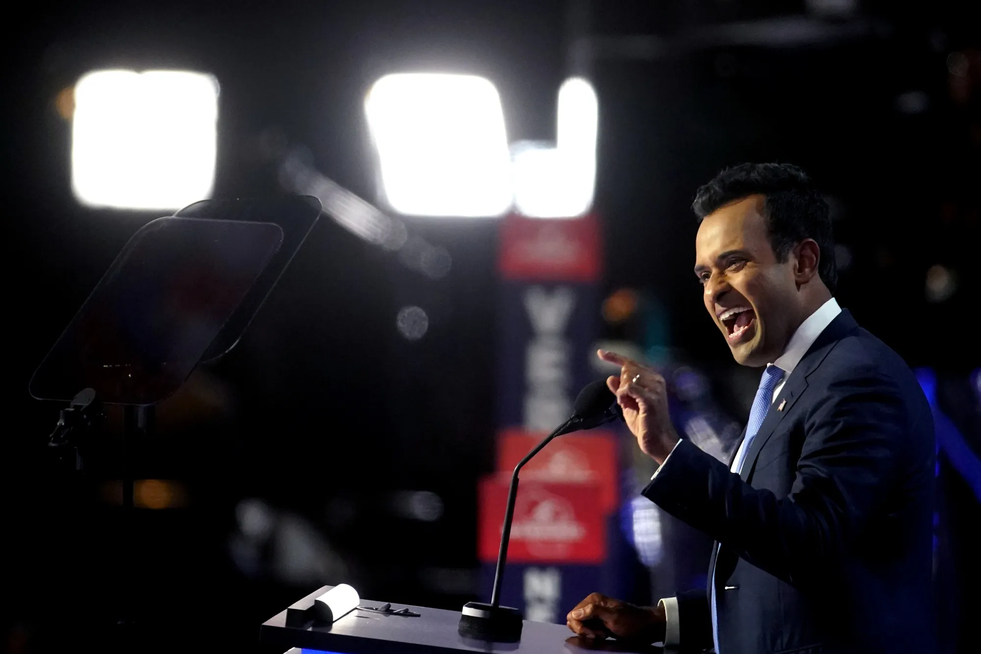 维韦克·拉马斯瓦米在2024年7月16日美国威斯康星州密尔沃基的共和党全国大会(RNC)上。摄影师:阿尔·德拉戈/彭博社虽然特朗普将他排除在副总统候选人之外,但据当时熟悉此事的人士透露,他早在3月就将他视为可能的内阁人选。