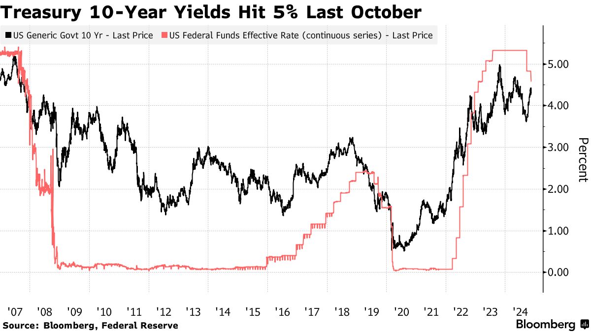 德赛加入了摩根大通资产管理和T. Rowe Price,警告投资者随着他们开始评估特朗普第二任总统任期对债务市场的影响,财政收益率将会上升。自11月5日选举以来,国债收益率一直在波动,因为交易员在权衡如果联邦预算赤字膨胀,美联储是否能够继续降息。