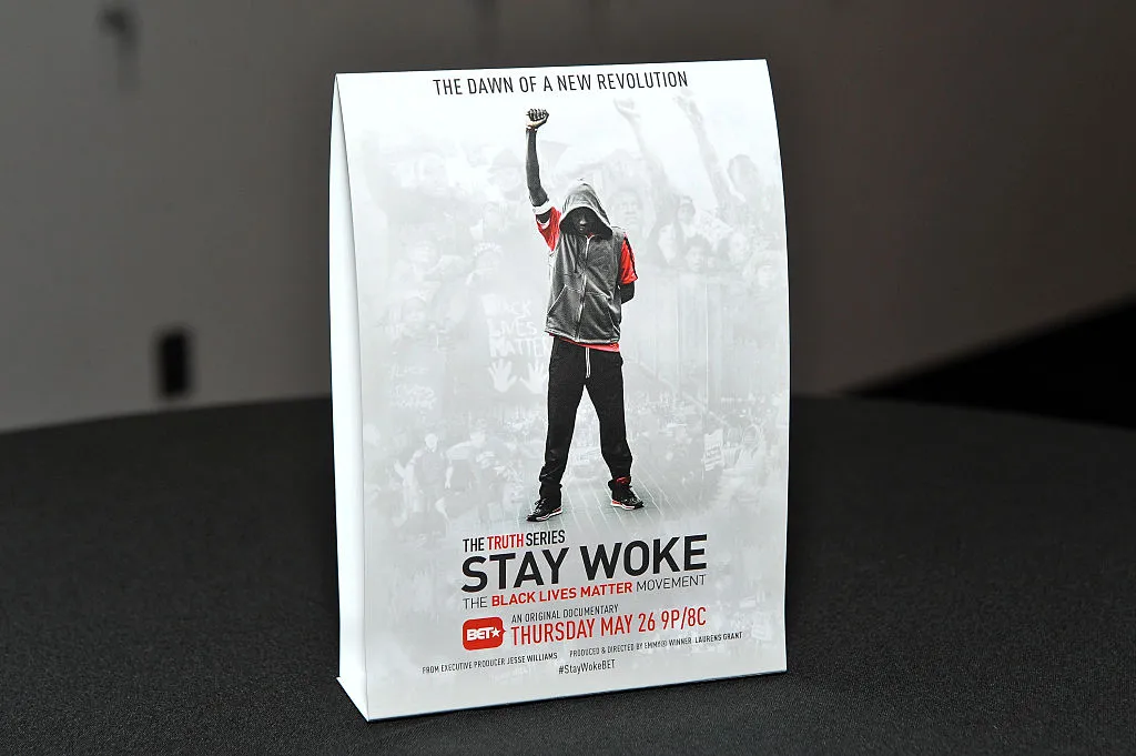 在2016年5月24日于纽约市举行的“保持觉醒:黑人的命也是命运动”放映期间,一张电影海报的视图。
