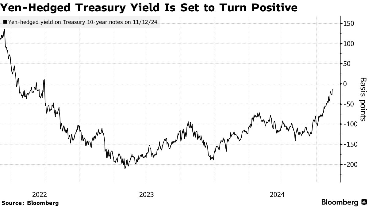 日元对冲的国债收益率预计将在两年来首次转为正值,因为唐纳德·特朗普的选举胜利推高了美国利率,而美联储的降息降低了对冲成本。