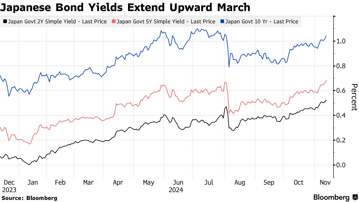 这亚洲国家的主权债券收益率随着美国国债的上升而攀升,预计当选总统唐纳德·特朗普将追求 通货膨胀政策,这也将推动日本的消费者价格上涨。