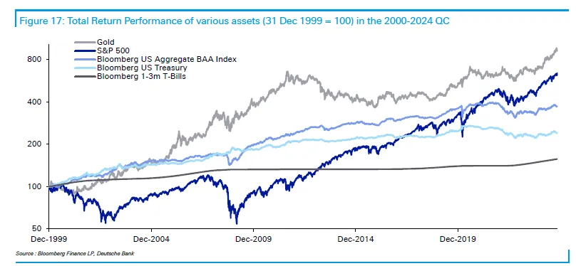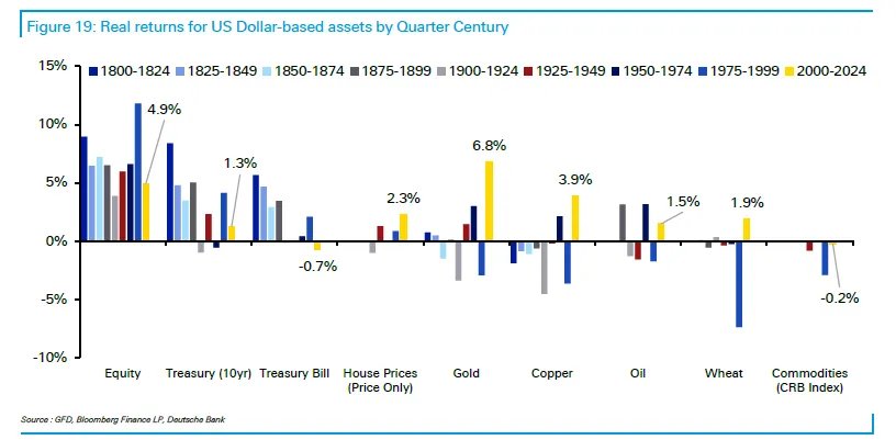 事实上,近5%的年均增长如此温和,使得这一资产类别在这个二十五年的时间框架内有可能首次表现不及黄金,而贵金属、铜和小麦则是表现最好的资产。