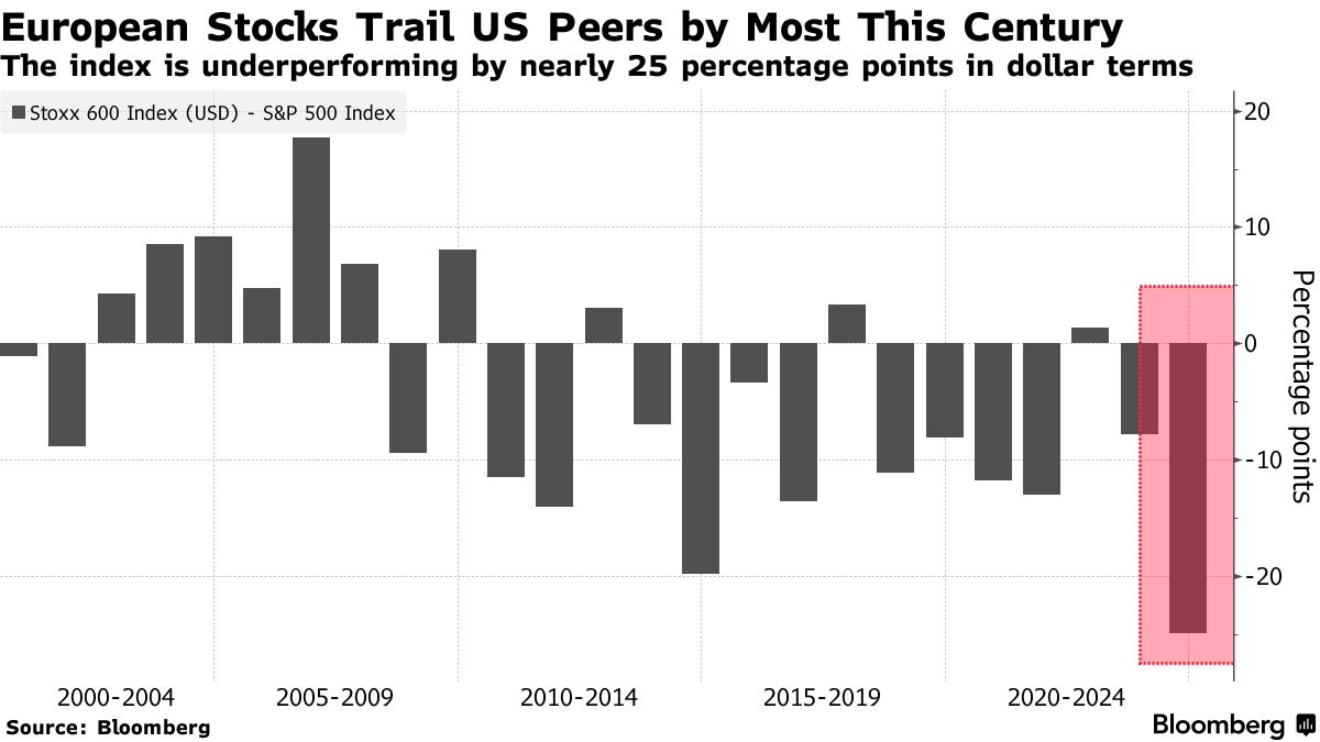 今年,Stoxx 600在美元计价上落后于S&P 500,差距是至少24年来最大的,一些投资者预计这一差距将保持较大。