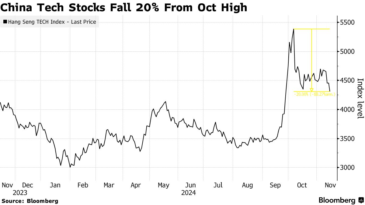 中国科技股在香港从十月高点下跌20% - 彭博社