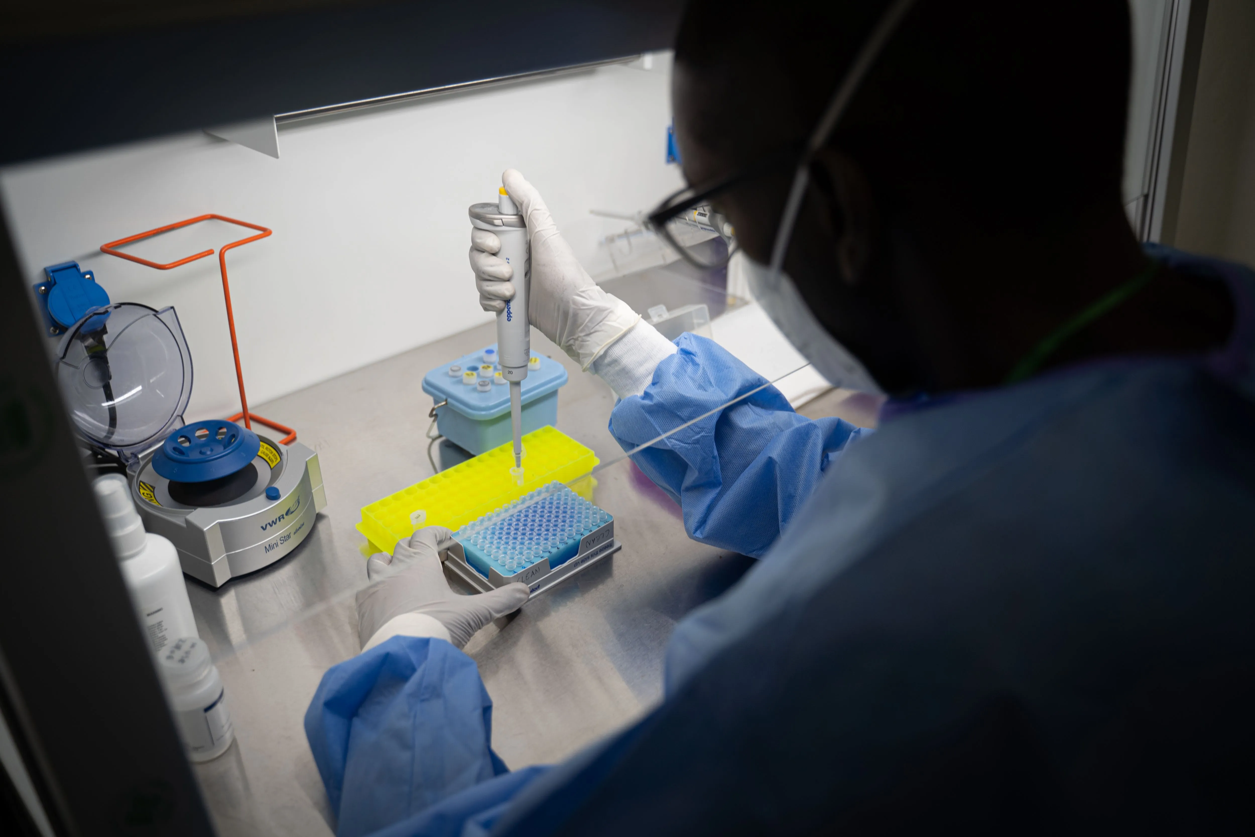 实验室技术人员在卢旺达基加利处理病毒样本进行检测。