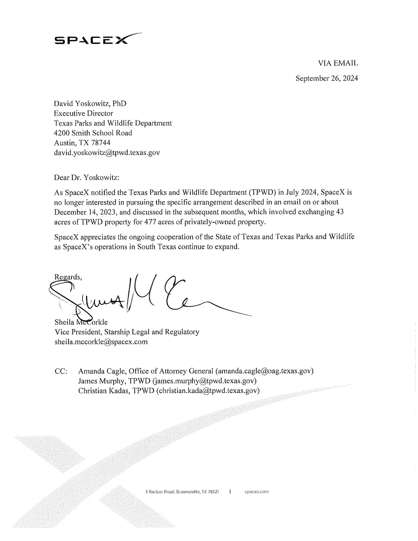 在一封9月26日的信中,SpaceX副总裁希拉·麦考克尔告诉德克萨斯州公园与野生动物部门该公司“已不再有兴趣追求具体的安排。”