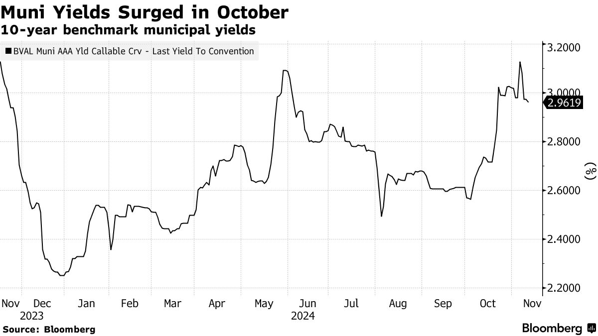 上个月在固定收益市场上发生的抛售使州和地方政府债务遭遇了超过一年以来的最大损失,收益率上升,因为强劲的经济数据和总统选举给美联储将如何大幅降息带来了不确定性。