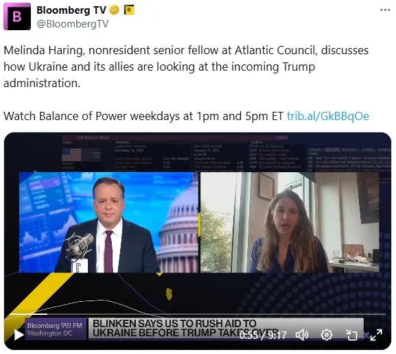 今天在彭博电视台的 权力平衡 早间版中,主持人乔·马修和凯莉·莱因兹采访了大西洋理事会的非驻外高级研究员梅琳达·哈林,讨论乌克兰及其盟友如何看待即将到来的特朗普政府。