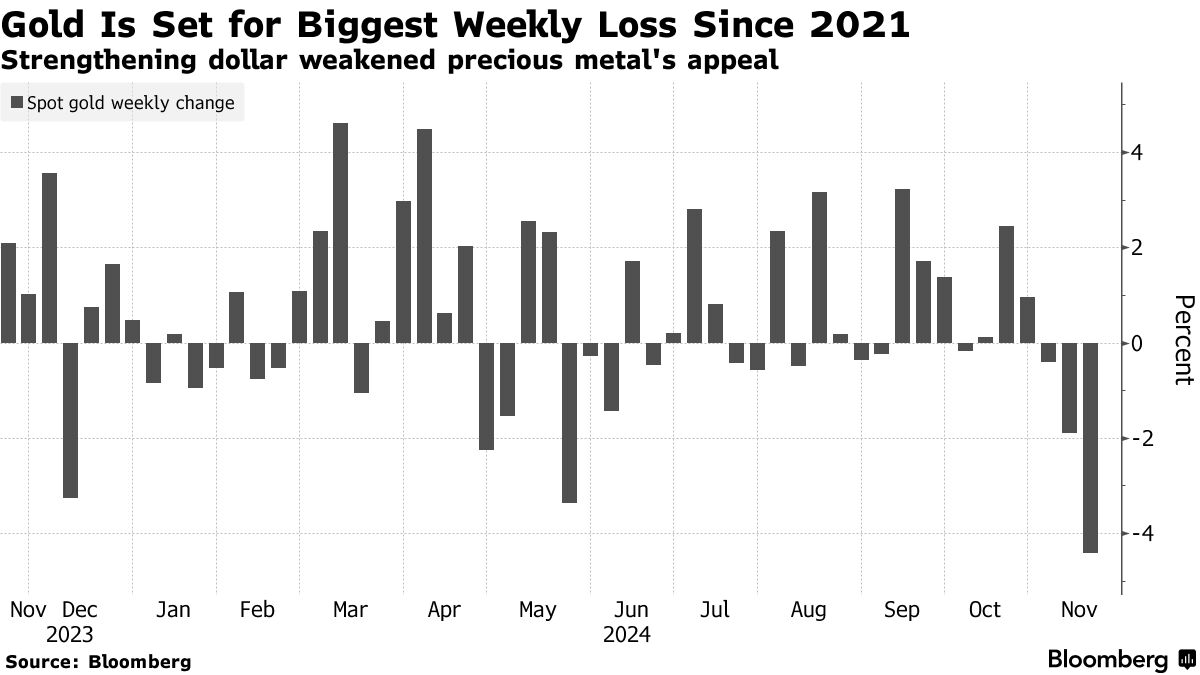 这贵金属自10月31日创下历史新高以来已下跌约8%,在唐纳德·特朗普上周赢得白宫后,损失加速。由于市场预期特朗普总统任期内经济增长和企业利润将上升,美元指数已升至两年高点。更强的美元使以该货币计价的商品对大多数买家来说变得更加昂贵。