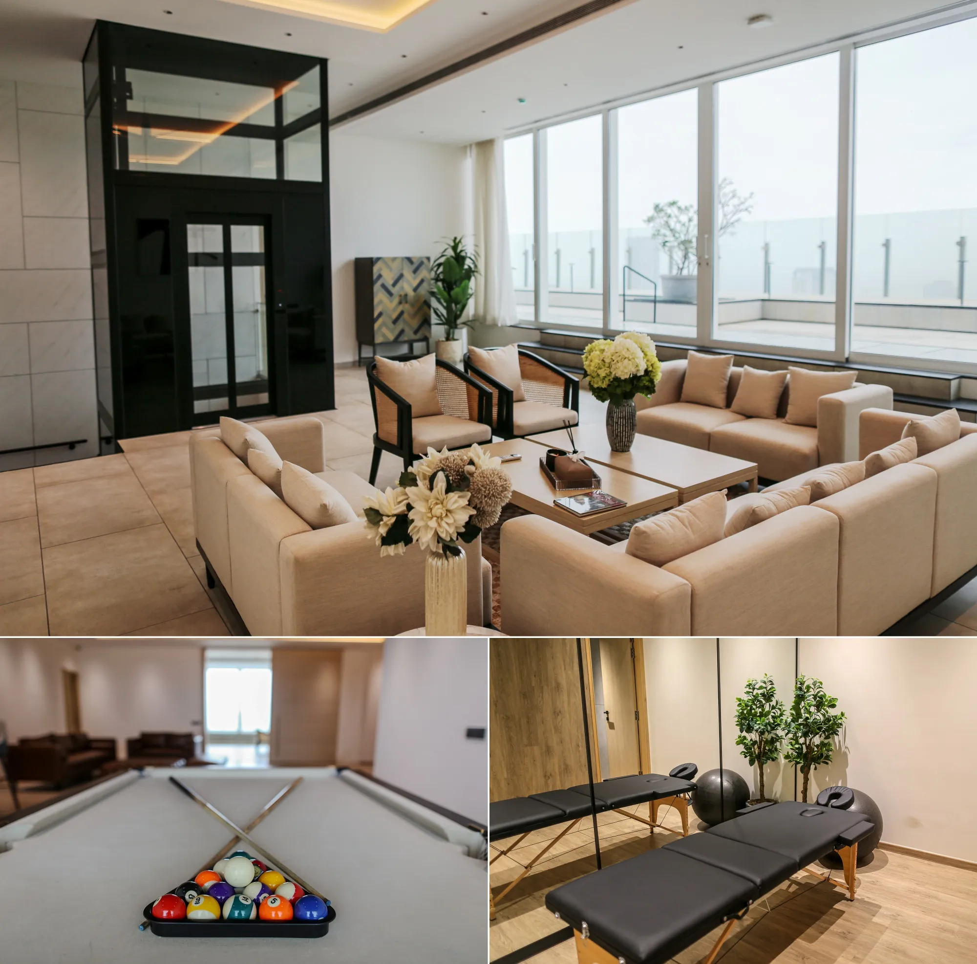 住宅区的特点之一是提供客房,居民可以付费使用,以便在大型家庭活动期间接待访客。该建筑还设有一个耆那教寺庙、一个音乐和舞蹈工作室、一个美容院以及为家政人员设立的独立入口。
