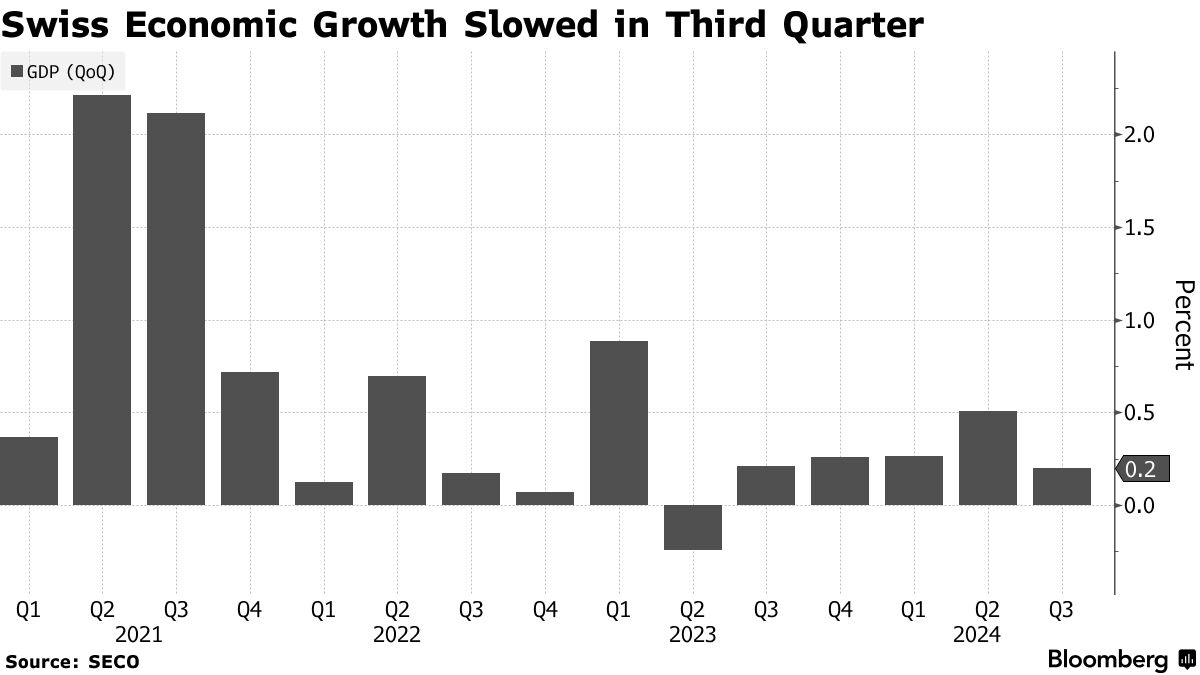 瑞士经济动能放缓,表明强势法郎和疲弱的外部需求正在对这个以出口为导向的国家造成影响。