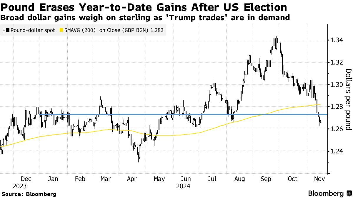 直到本周,英镑一直设法抵御美元的强势,得益于市场对英国利率将比美国更逐渐下降的预期。但随着市场为大规模关税和特朗普政府下的减税措施做准备,这一优势正在被削弱。
