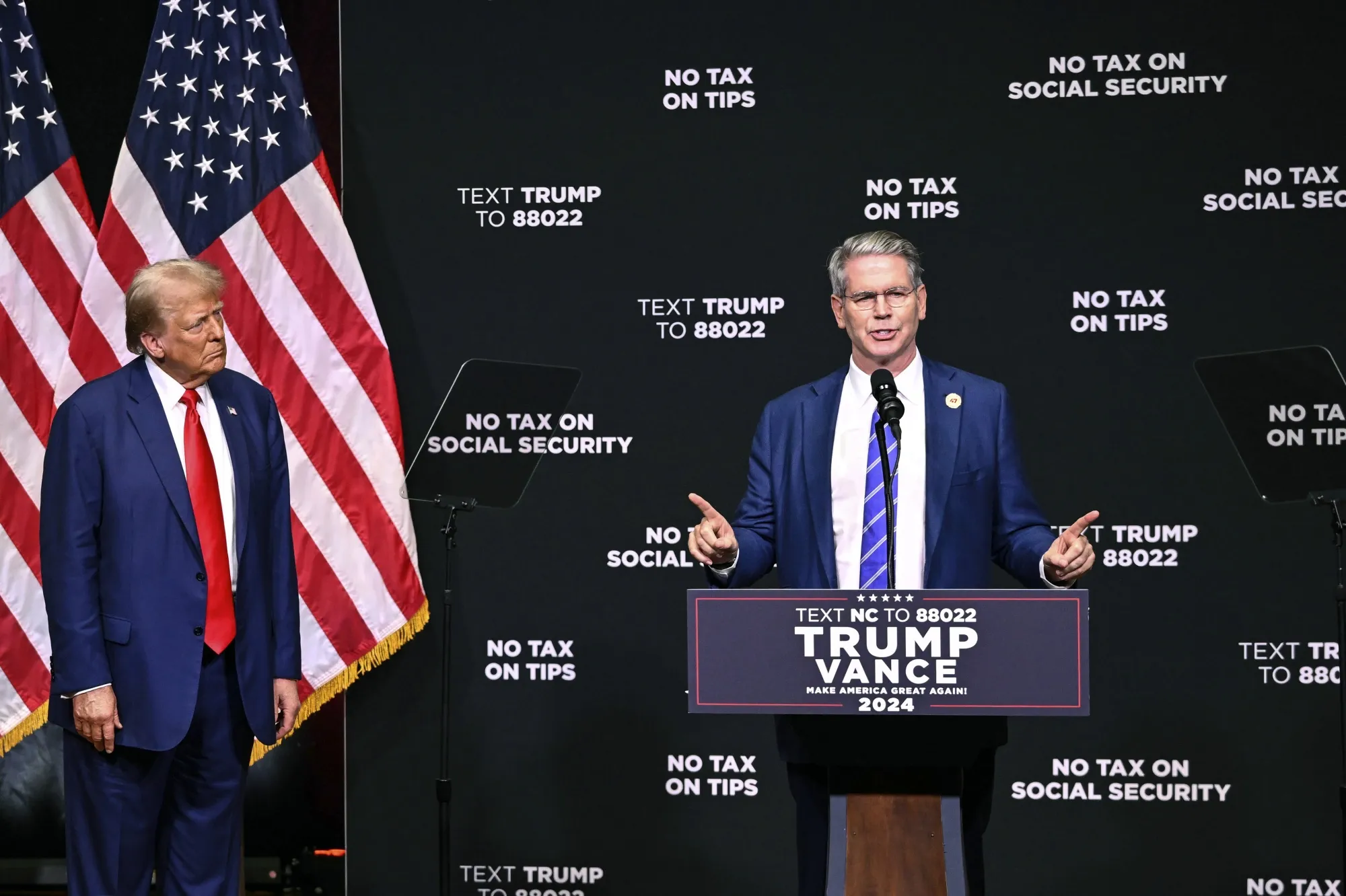 唐纳德·特朗普在北卡罗来纳州阿什维尔聆听斯科特·贝森特关于经济的讲话,时间是8月14日。