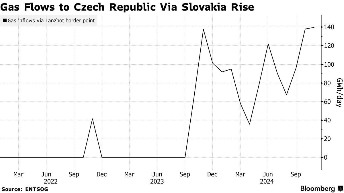 捷克管道运营商Net4Gas的数据表明,去年冬天,从东部进入该国的假定俄罗斯天然气量占所有进口流量的约一半,而到目前为止,本季度这一比例已上升至约74%。一小部分天然气通过该国转运到德国和波兰。