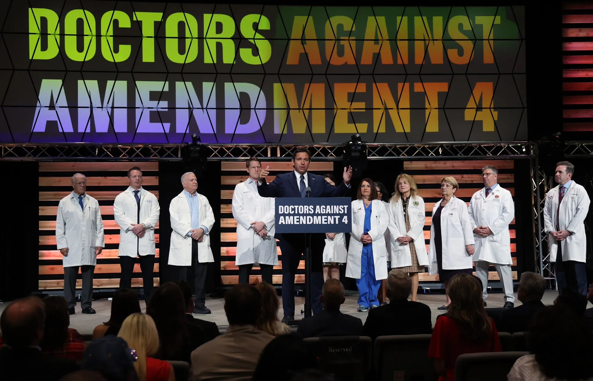 罗恩·德桑蒂斯在一次针对堕胎权公投措施的竞选活动中。摄影师:里卡多·拉米雷斯·布克萨达/奥兰多哨兵通过盖蒂图片社特朗普在共和党初选期间不断攻击德桑蒂斯,给他起了个绰号“罗恩·德圣洁”。德桑蒂斯在一月份退出了竞选。两人后来和解,但德桑蒂斯很少为特朗普助选,而是专注于击败那些将合法化娱乐性大麻和放宽堕胎限制的公投措施。