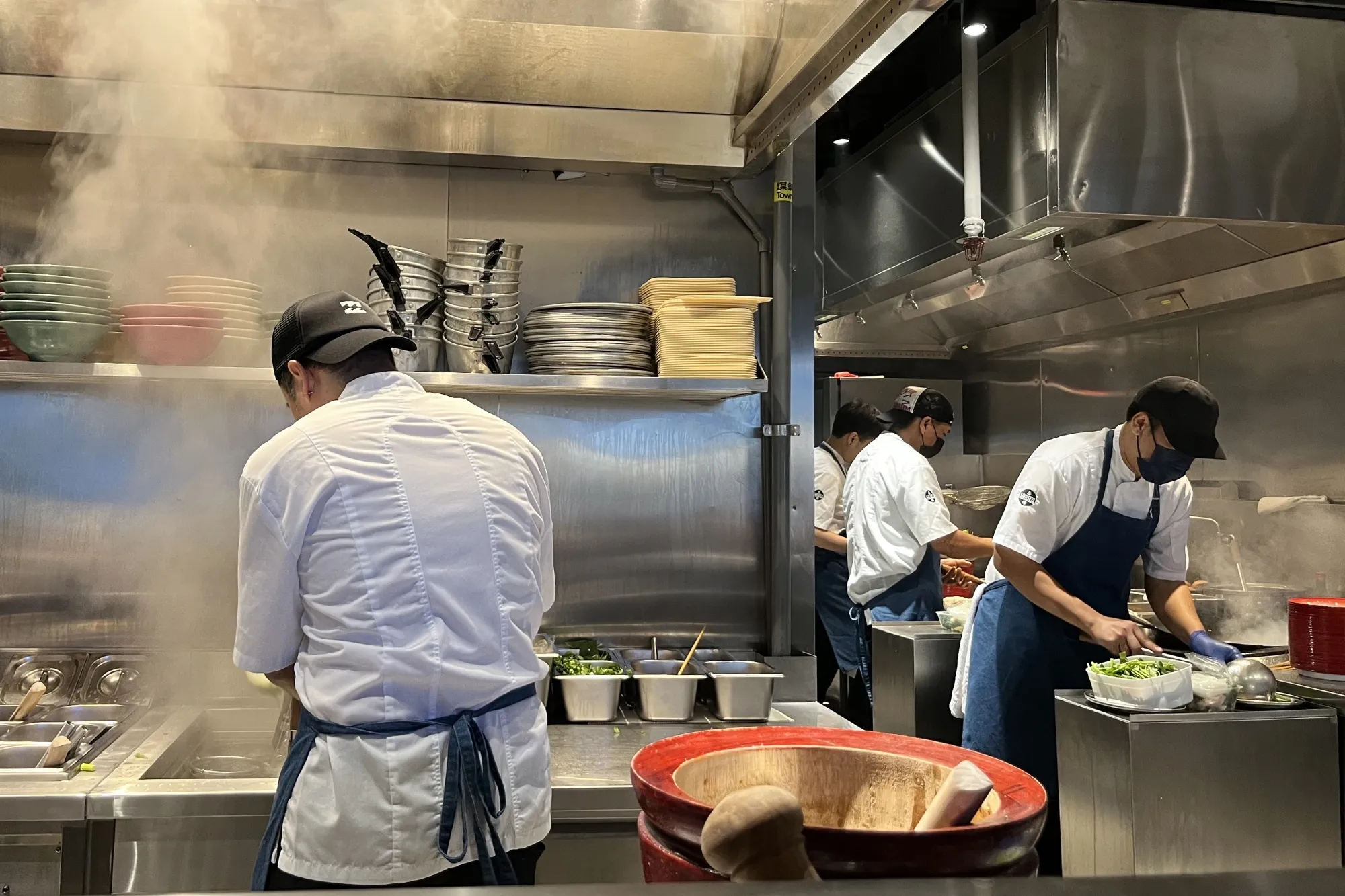 **你旁边的人:**我们坐在面向开放厨房的酒吧区域,工作人员正在煮船面汤和用石臼制作辣椒酱。我们身后有四个人坐在圆桌上。较大的团体坐在靠近入口的桌子上。