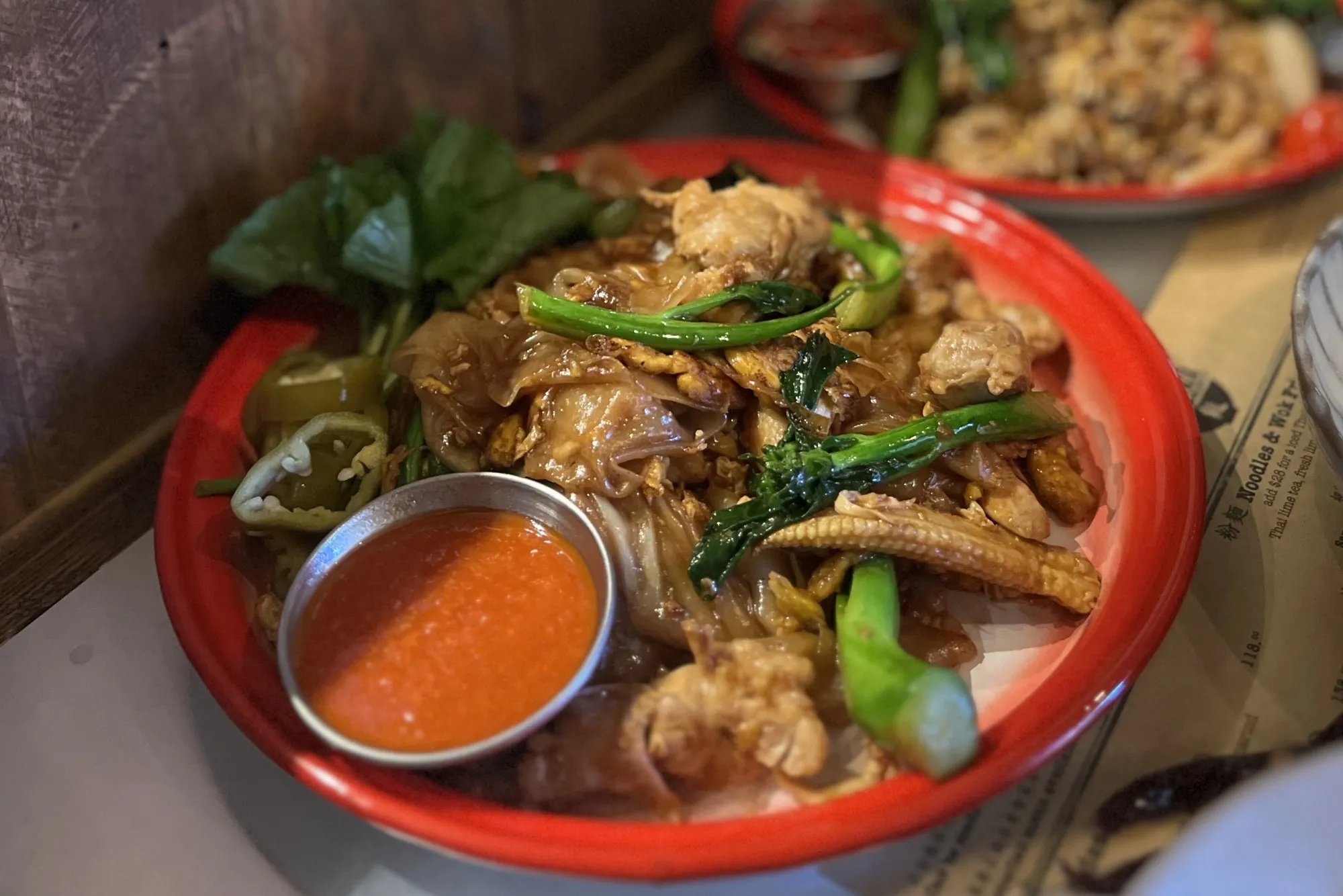 **我们会再次点的菜:**我们非常喜欢炒鸡肉和扁面条(HK$148),配有甜蚝油、婴儿玉米和鸡蛋。它的味道浓郁,与脆绿蔬菜搭配得很好。虽然面条中已经有一点辣味,但可以随意再加一层Sriracha,并搭配旁边的墨西哥辣椒,给它增添额外的风味。