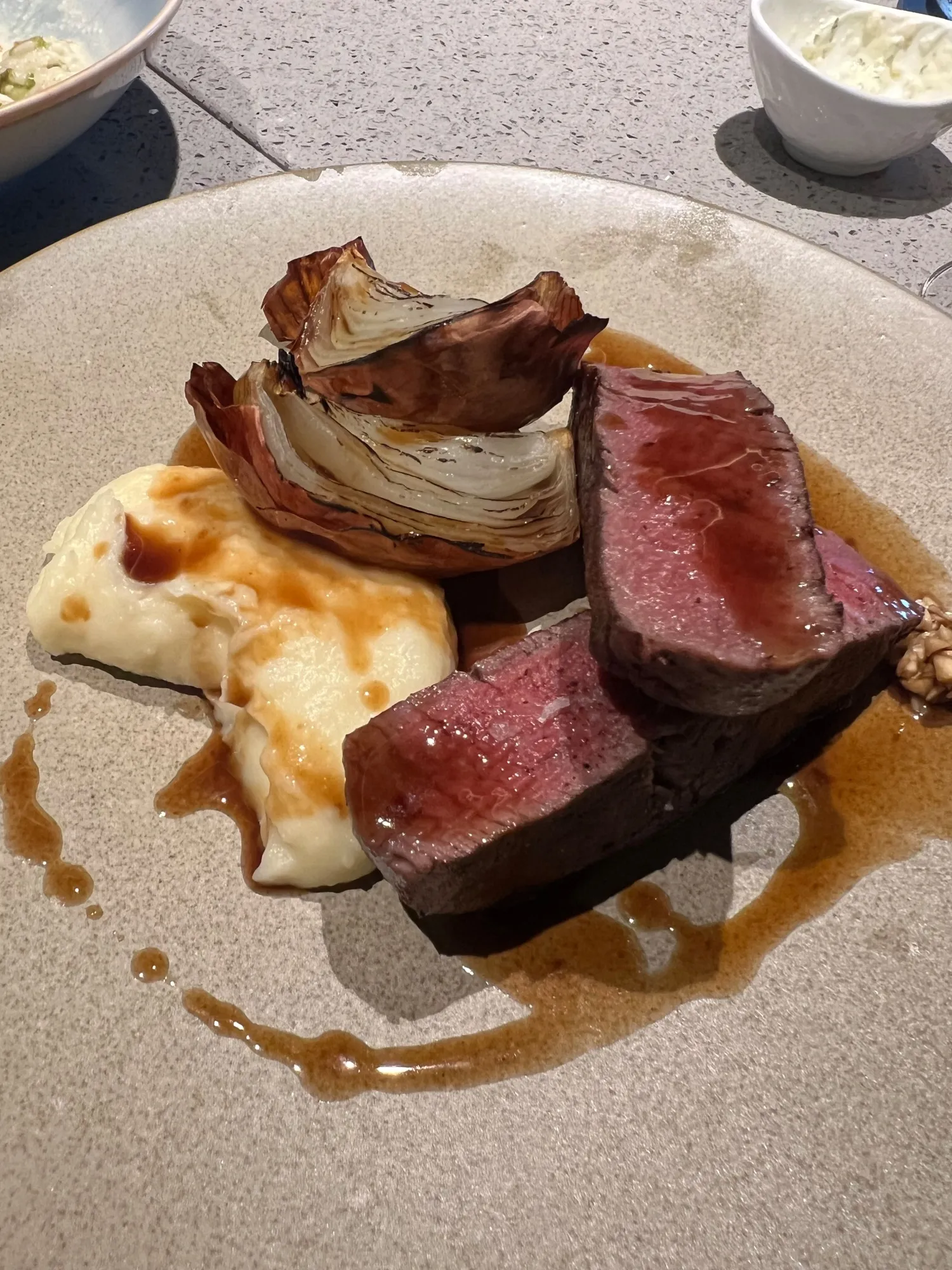 Pulsii的和牛牛排。摄影师:凯蒂·特纳/彭博社我们会再次点的菜。 套餐午餐在价格上真的很划算(S$35 两道菜),有坚果味和风味十足的南瓜汤,接着是烤海鲷海藻意大利饭。鱼的烹饪恰到好处,入口即化。对于日本和牛嫩腰肉的烹饪方式(S$95),我们没有任何疑问。这在我们的开胃菜之后被视为一个好兆头,结果也没有让我们失望。我的同伴称其为“我今年吃过的最好肉”——这对于一个忠实且旅行广泛的肉食者来说,确实是很高的赞誉。