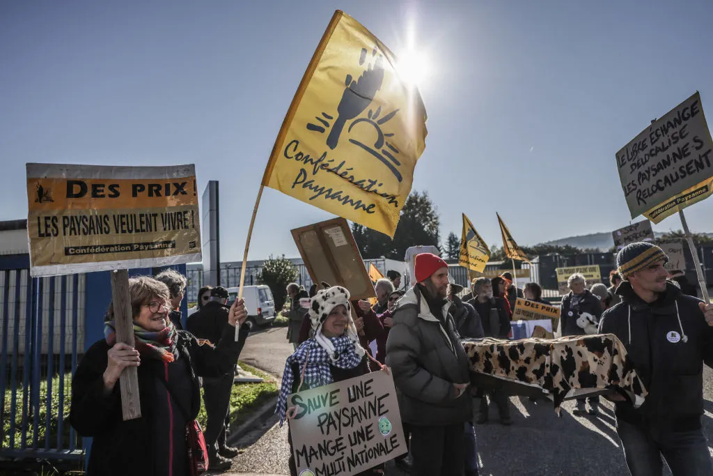 由法国外阿让的农民工会Confédération Paysanne du Lot et Garonne组织的集会,抗议欧盟与南美洲梅尔科苏尔集团之间的协议,时间为11月15日。
