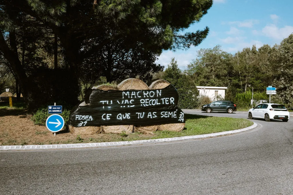 在法国西南部梅尔维尔的环形交叉口上,横幅上写着“马克龙,你将收获你所播种的”的信息。摄影师:帕特·巴塔尔/法新社。盖蒂图片社 马克龙的困境