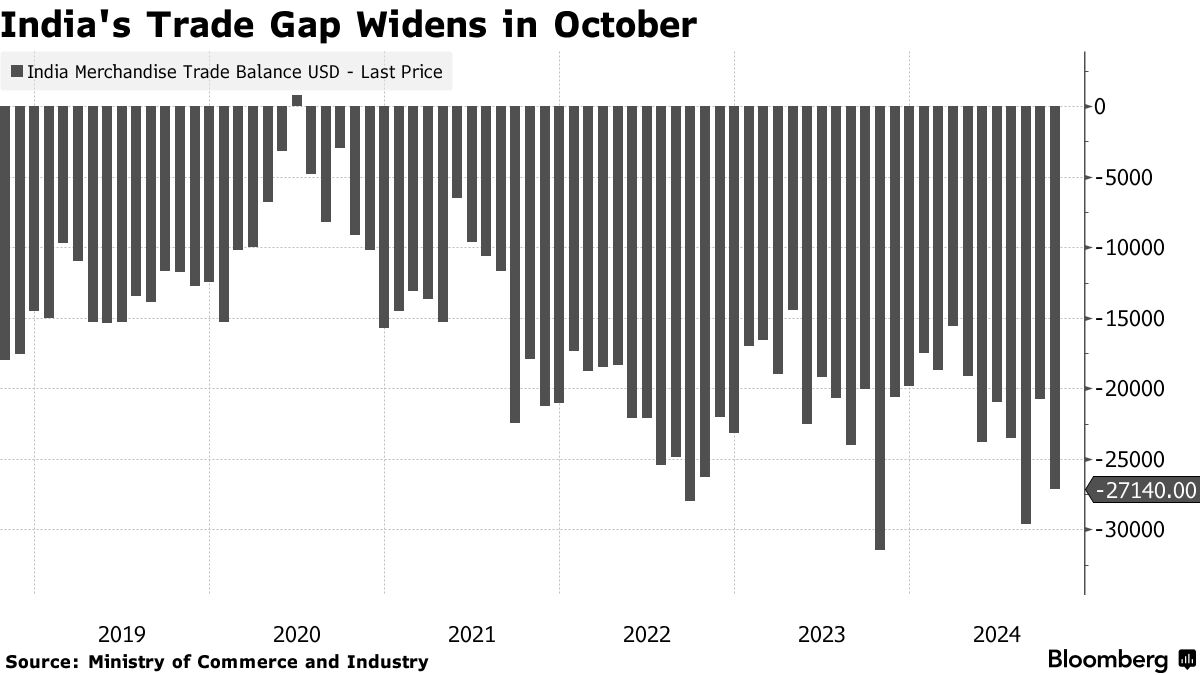 印度的贸易逆差在十月份显著扩大,因为在印度教节日季节期间进口激增,尽管出口增长强劲。