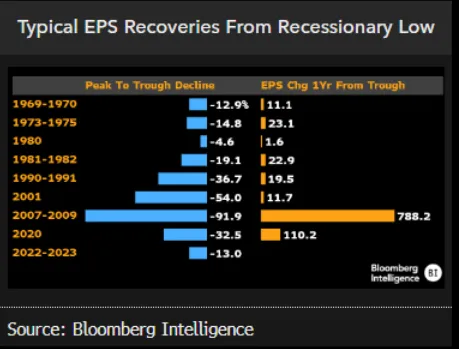 从高峰到低谷,标准普尔500指数在其三季度盈利衰退期间(截至去年)录得13%的每股收益收缩,按过去12个月的基准来看,BI汇编的数据表明。这远低于自1960年代末以来的中位数26%的高峰到低谷跌幅。