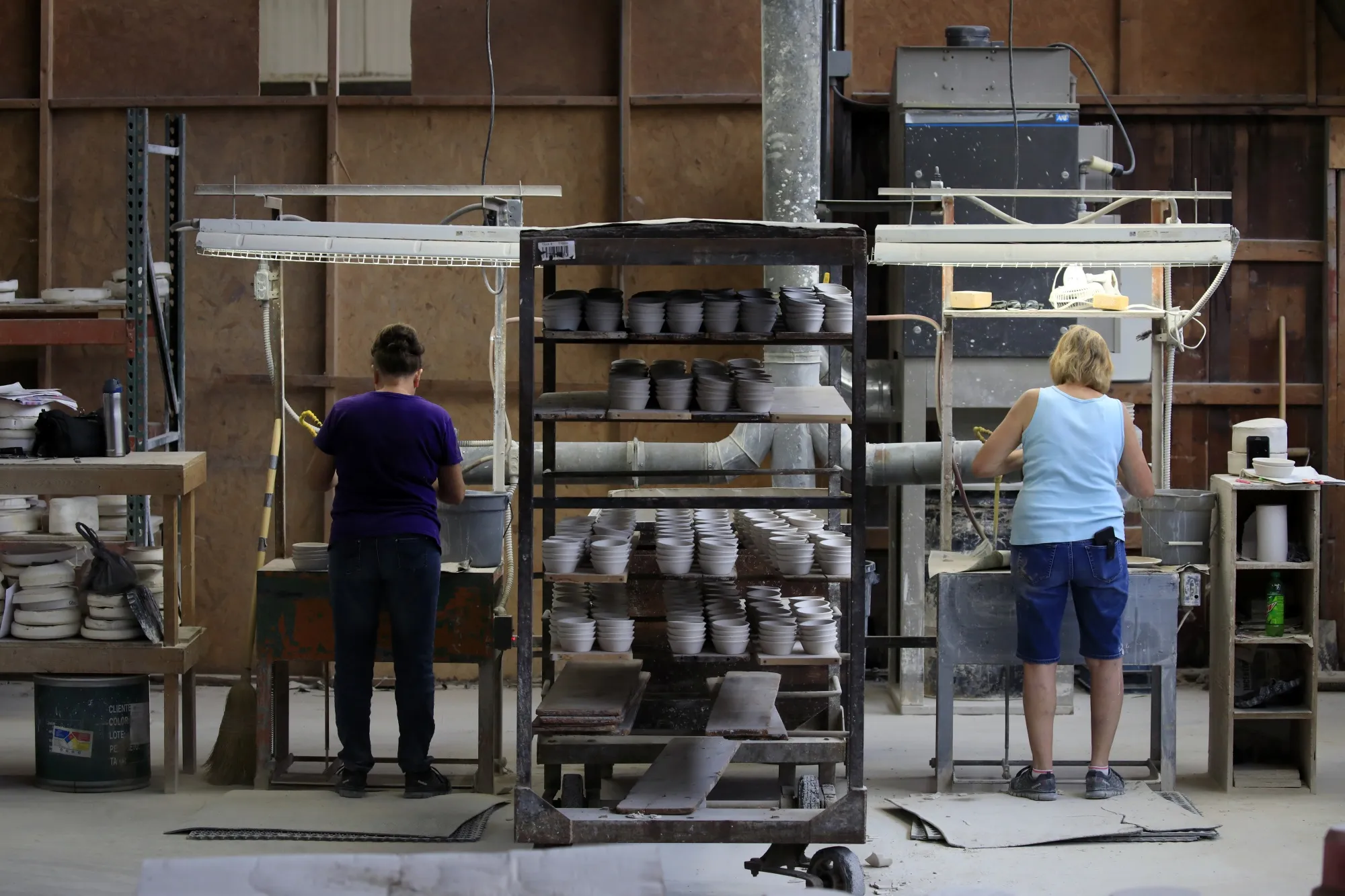 工人在西弗吉尼亚州纽厄尔的一家工厂制造餐具。