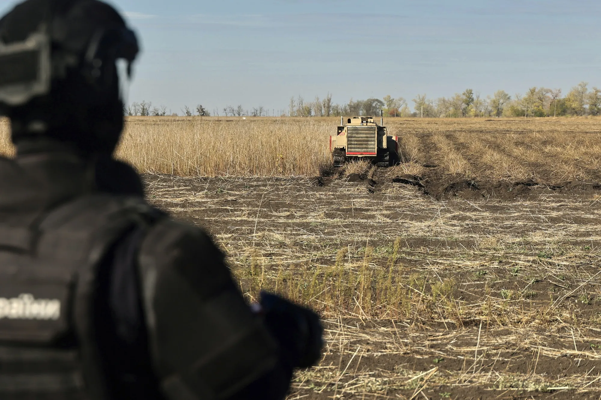乌克兰国家紧急服务队的排雷小组在乌克兰斯维亚托希尔斯克使用遥控GCS-200排雷车辆清理一片田地。摄影师:皮埃尔·克罗姆/盖蒂图片社九个月的俄罗斯占领使乌克兰南部伊娜·博伊科的5万公顷农场中有超过一半布满了炮弹坑、烧毁的设备和危险的地雷。当她和其他数百名农民在2022年11月返回位于尼古拉耶夫地区的村庄时,她决心清理田地并重新种植。