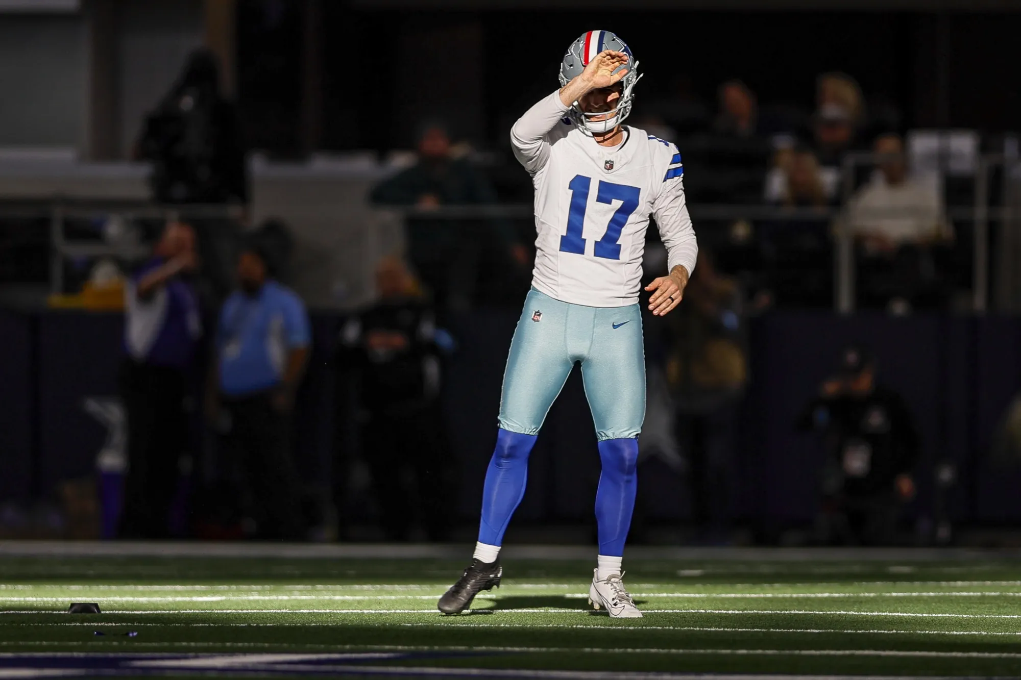 达拉斯牛仔队的踢球手布兰登·奥布里在2024年11月10日于德克萨斯州阿灵顿的AT&T体育场开球前被阳光刺眼。