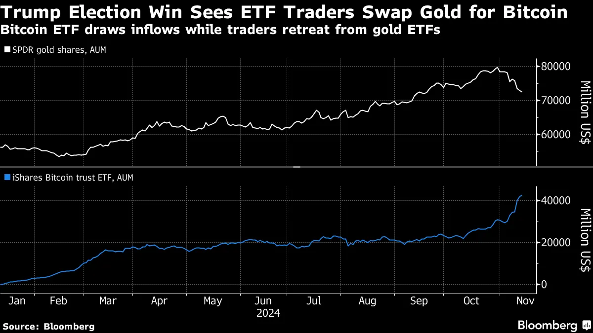 加密货币自选举日以来也大幅上涨,预计特朗普的政策将推动数字资产。iShares比特币信托ETF、黑石公司的现货比特币ETF的总资产在上周首次超过400亿美元。这一激增恰逢全球最大的实物黄金ETF SPDR黄金信托的资金大幅流出。